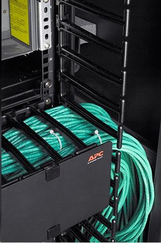 2dílné sekce správy kabeláže mají u každé pozice 1U hladké plastové výstupky, které umožňují uspořádaný vstup a výstup propojovacích kabelů.