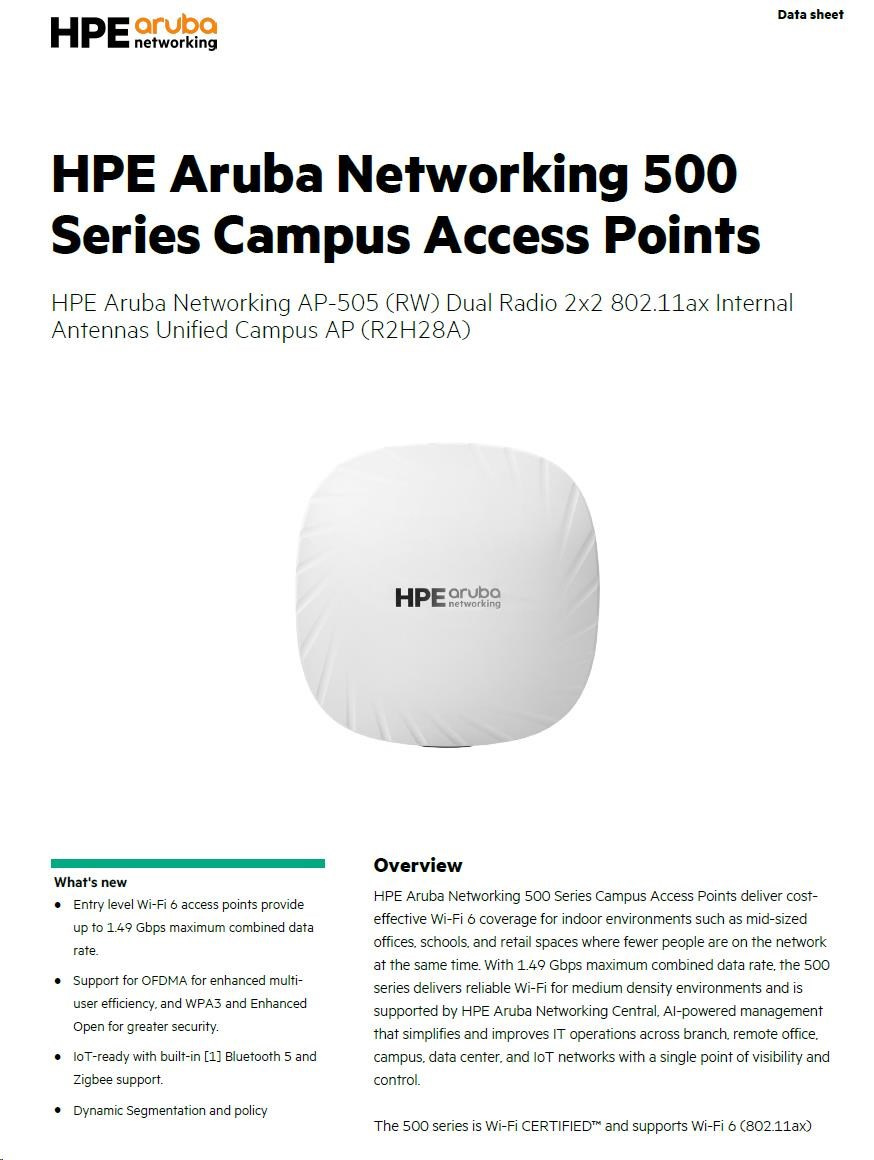 The HPE Aruba 500 Series delivers affordable, high-performance Wi-Fi 6 for schools, midsize offices, and retailers. With up to 1.49 Gbps real-world speed, it supports mobile, IoT, and demanding user needs.