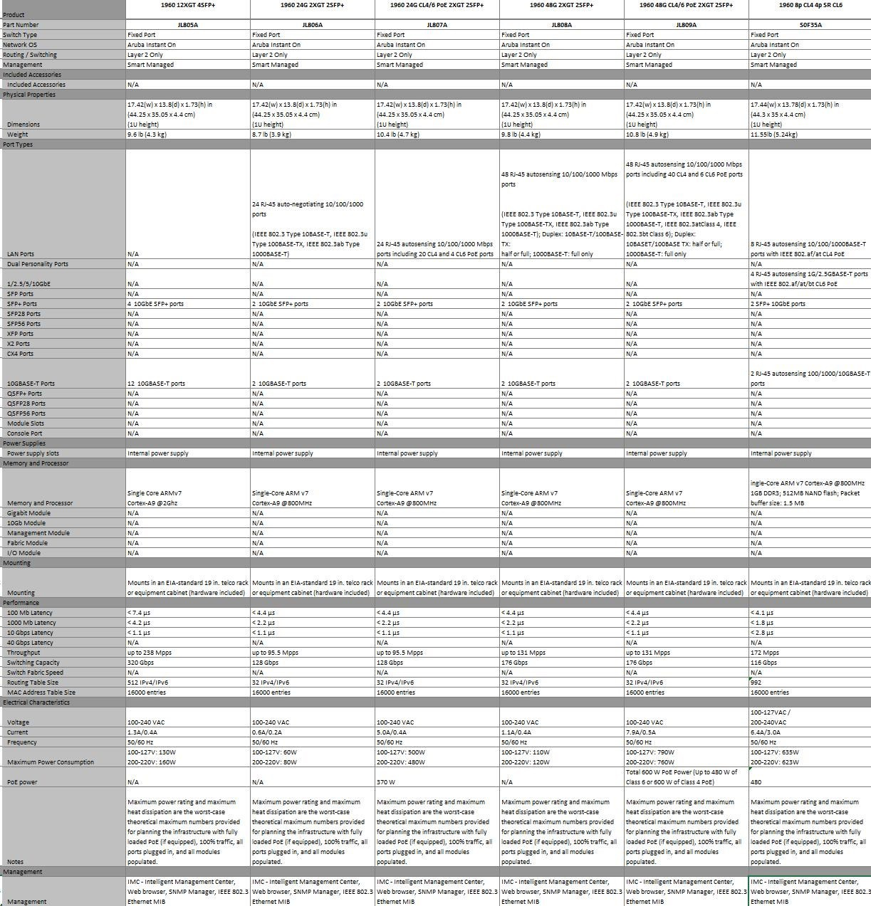 Notes1: 1 Acoustics measured in 23°C semi-anechoic chamber with a loading of 100% traffic and (for JL807A and JL809A) 50% PoE on all ports. Measured in accordance with ISO 7779. Declared in accordance with ECMA-109:2010. Values presented are the Declared A-Weighted Sound Power Level (LWAd) and the mean Bystander A-Weighted Sound Pressure Level (LpAm)