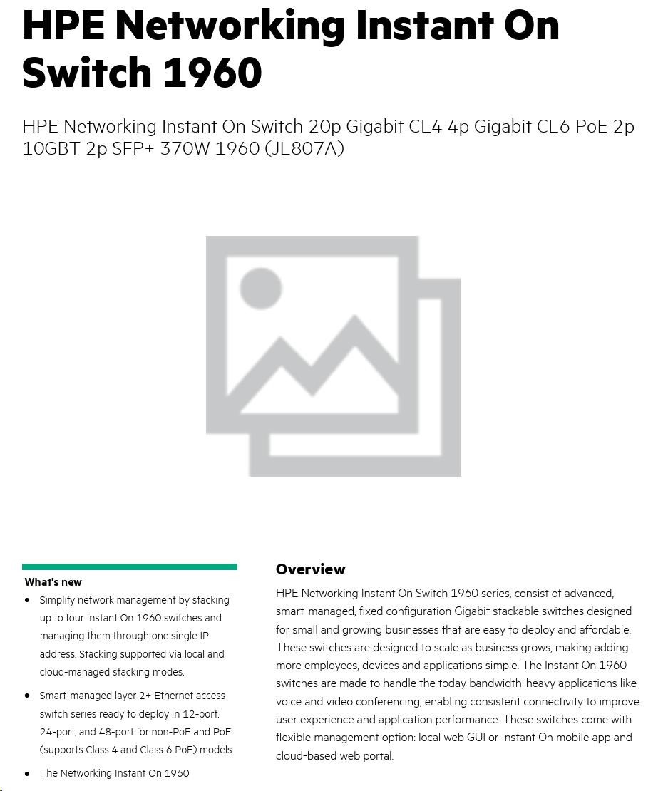 HPE Networking Instant On Switch 20p Gigabit CL4 4p Gigabit CL6 PoE 2p 10GBT 2p SFP+ 370W 1960 (JL807A).