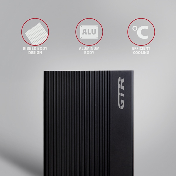 Vnitřní rámeček boxu dobře fixuje a chrání vložený disk. Žebrované hliníkové tělo boxu napomáhá chlazení a ochraně disku. Gumové pásky omezují posouvání po stole. Elegantní povrch boxu brání nežádoucím otiskům prstů.