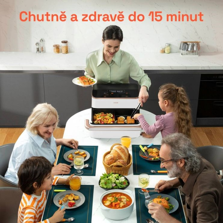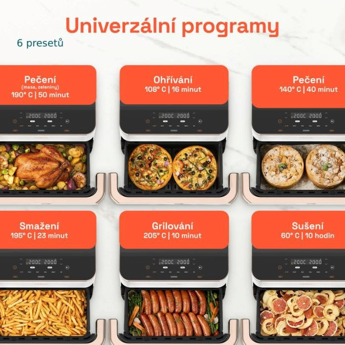 Cosori TwinFry zvládne díky šesti programům péct, fritovat, grilovat, péct sladké i slané a také třeba sušit. Je jedno jestli budete potřebovat celý 10l koš nebo vám stačí jen polovina. Fritéza rozdělením koše dokáže připravit dva nezávislé pokrmy, a to se hodí obzvlášť při přípravě jídla a přílohy najednou. Ovládací prvky jsou tak pohodlné a intuitivní, že se vaření stane záležitostí několika dotyků, a ne celodenního pobytu u kuchyňské linky.