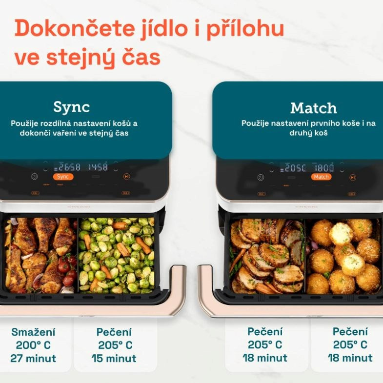 - Funkce Sync pro dokončení vaření ve stejnou dobu v obou koších