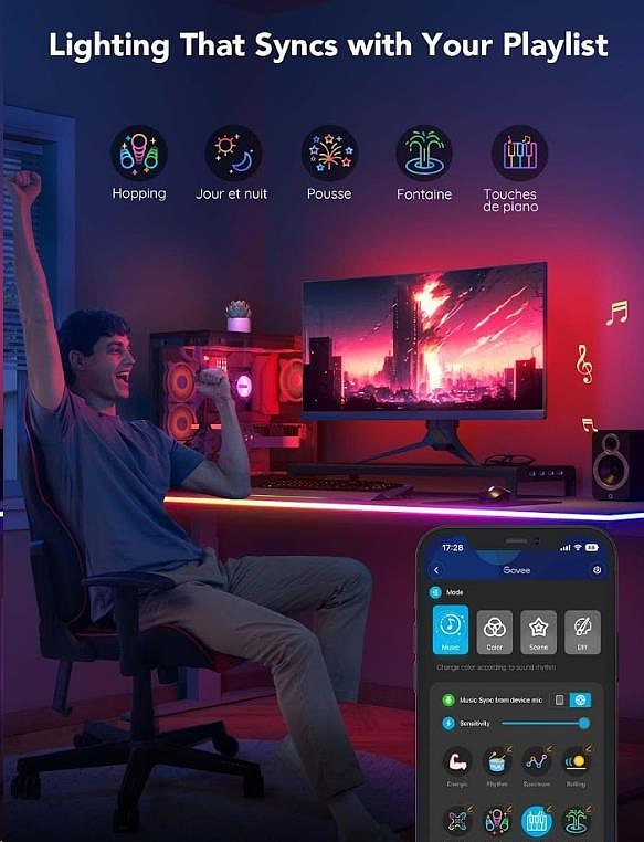 Světelné pásky se hladce synchronizují s vaší hudbou podle rytmu při sledování filmů, hraní her a poslouchaní hudby. Celkově je na výběr až z 11 hudebních režimů.
