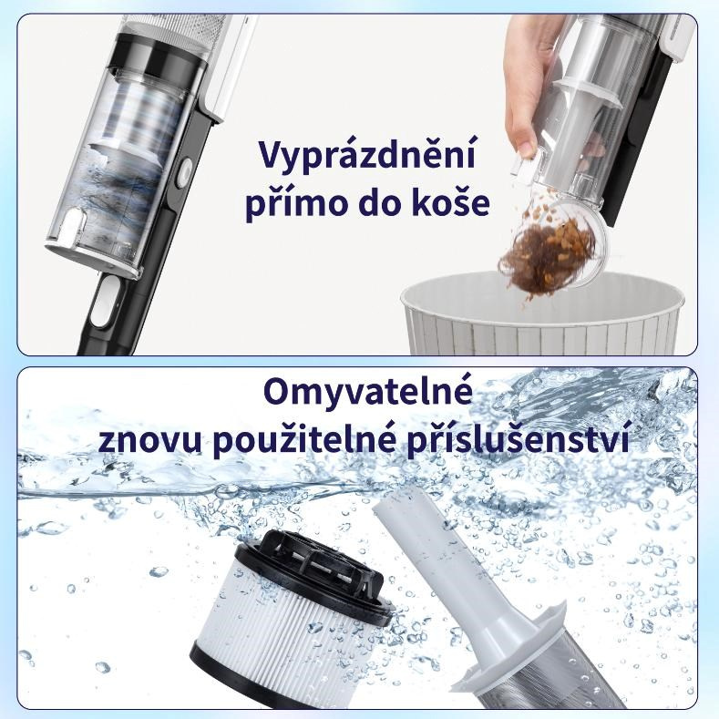 LVAC200 můžete stiskem jednoho tlačítka vyprázdnit přímo do koše. Jeho filtry a kartáče jsou navíc omyvatelné. Hygiena zaručena.
