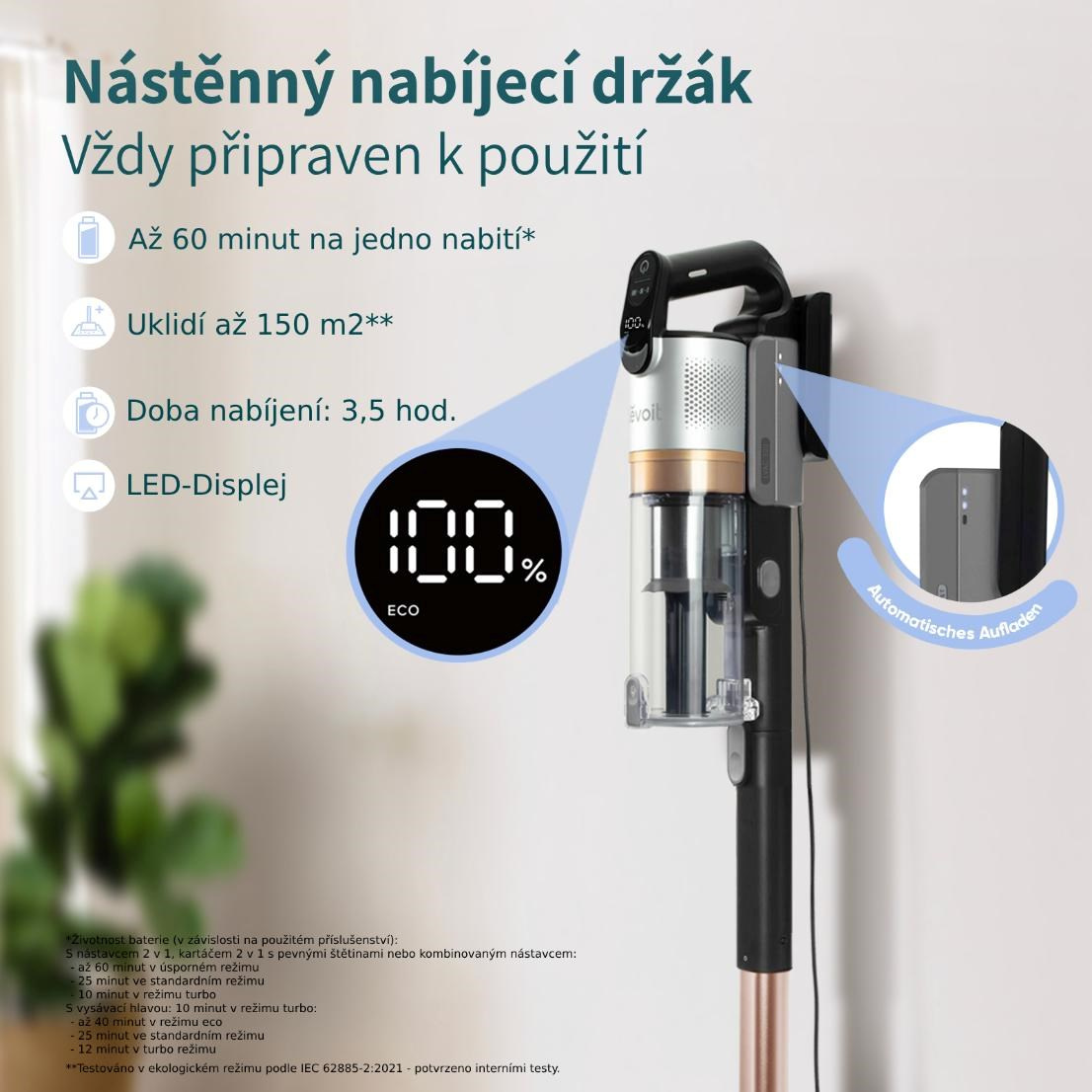 Promyšlený design vysavače usnadňuje každodenní používání – baterii jednoduše odejmete a dobijete samostatně, bez nutnosti manipulace s celým přístrojem. Díky plochému kloubu dosáhnete i pod nízký nábytek, kam se běžný vysavač nedostane. Sestavení a výměna nástavců je otázkou vteřin, takže můžete plynule přecházet mezi různými typy úklidu bez zdržování.