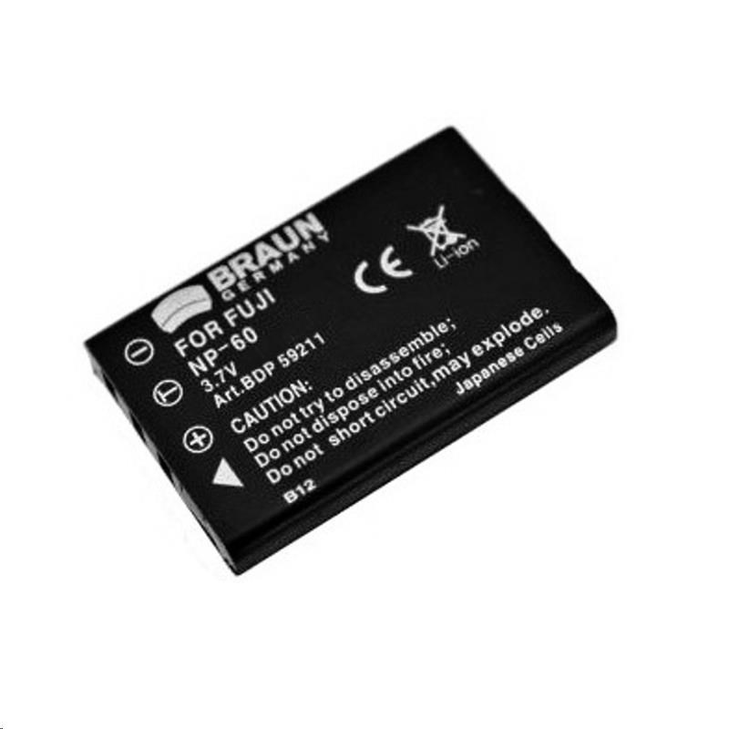 Li-Ion akumulátor Braun BDP-FNP60 (3,7 V/1100 mAh). Ekvivalentní s akumulátory: * Fuji NP-60 * Panasonic S003/S302 * Kodak Klic 5000 * Samsung SLB-1037 * Samsung SLB-1137 * Ricoh DB-40 * Pentax D-Li2 * Olympus LI-20B * HP DB-40 * Casio NP-30 * Toshiba NP-60 * Panasonic VBA10/S301 Určen pro digitální fotoaparáty a videokamery: * FUJI FinePix 50i, M603 * FUJI inePix F401i, F402, F410, F420, F601 * PANASONIC SV AS3, AS10, AS30 * PANASONIC SV AV20, AV25, AV30, AV35, AV50, AV100 * PANASONIC SV PT1 * KODAK EasyShare DX6490, DX7440, DX7590, DX7630 * KODAK EasyShare LS420, LS433, LS633, LS743, LS753 * KODAK EasyShare P712, P850, P880 * KODAK EasyShare Z730, Z750, Z760, Z7590 * KODAK Easy S-One 4, S-One 6 * SAMSUNG Digimax i7, i73, i74, i80 * SAMSUNG Digimax U-CA3, U-CA4, U-CA5, U-CA401, U-CA501 * SAMSUNG Digimax V700, V800 * RICOH Caplio RR10 * PENTAX Optio 330, 330RS, 430, 430RS * OLYMPUS Camedia AZ1, AZ2 * OLYMPUS Ferrari 2004 * HEWLETT PACKARD R507, R707, R717, R817 * CASIO QV R3, R4 * TOSHIBA Camileo S10, P10, P20, P30 * TOSHIBA Camileo H20, Pro, HD * videokamery PANASONIC Tento akumulátor je dodáván v částečně nabitém stavu. Před použitím je vhodné akumulátor nabít. Plné kapacity akumulátoru může být dosaženo až po cca 4-5 nabíjecích cyklech..