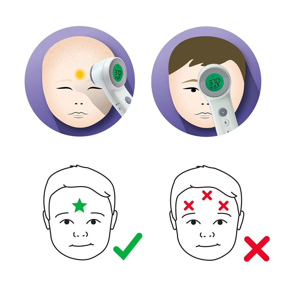 Bezdotykový + dotykový teploměr s přesností Age Precision. Patentovaný teploměr využívá technologii pro snadné, bezdotykové a neuvěřitelně přesné měření teploty. Chcete-li provést měření v dotykovém režimu, umístěte teploměr mezi obočí na čelo. V bezdotykovém režimu držte teploměr mezi obočím přibližně 2 cm před čelem dítěte..