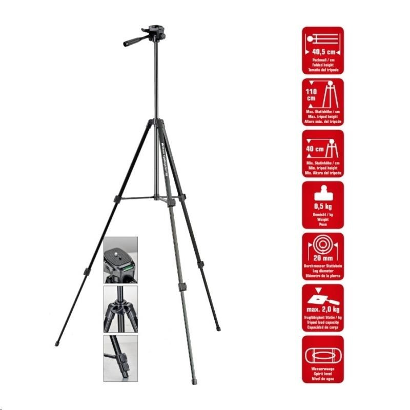 Lehký hliníkový foto/video stativ, 3-směrná hlava s výměnnou destičkou, vodováha, 3 segmenty noh se svorkami, profil 20mm, zatížení maximálně 2kg, rozměry: složený 40,5cm / výška 40-110cm, hmotnost 500g, barva černá, včetně pouzdra. Středový sloupek se vzpěrami pro vyšší stabilitu, nastavení výšky s aretací šroubem, nohy zakončené gumou..