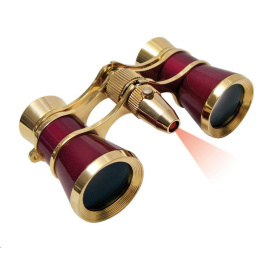 Dalekohled divadelní OPERA s LED světlem 3x25, zvětšení 3x, přední čočka 25mm, optický výstup 8,3mm, vzdálenost středu očí 60-72mm, světelnost 68,9, stmívání 8,7, rozměry 32x50x110 mm, hmotnost 140g, vínový a zlatý. Divadelní s Galileo nadčasovým designem pro zlepšený kulturní zážitek, minimální rozměry, malá hmotnost, vynikající optická kvalita s achromatickou úpravou skleněných čoček BK7, pozlacená kovová konstrukce s vínovými plastovými tubusy, decentní červené LED světlo pro možnost přečtení textu a orientace v prostoru. Včetně pouzdra a čistícího hadříku. Kvalitní skleněná optika v klasickém divadelním kukátku s červeným LED světlem..