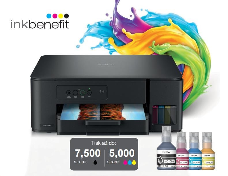 Kompaktní tiskárna 3 v 1 DCP-T230 tiskne déle s inkoustovými lahvičkami se super vysokou výtěžností, což snižuje náklady na barevnou stránku. Rychle naplňte nádržky během několika sekund, aniž byste museli držet lahvičky. Doplňování inkoustů je jednoduché a bez rizika jeho rozlití. Inovativní systém zámku lahviček zajišťuje, že vždy doplníte správnou barvu.