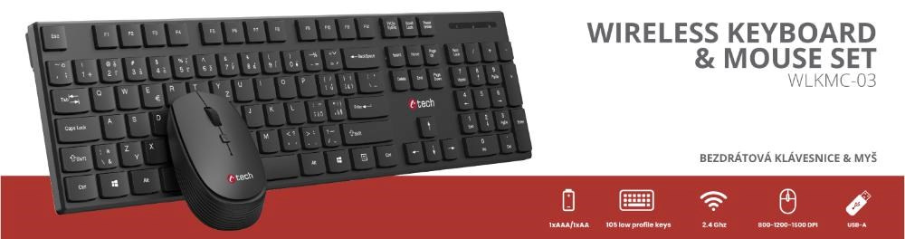 C-TECH klávesnice s myší WLKMC-03, Bezdrátový set 2.4GHz, CZ, Černá