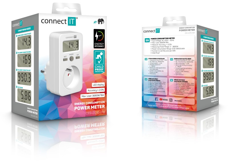 Digitální měřič CONNECT IT "PowerMeter" s jednoduchým designem slouží k měření spotřeby elektrické energie různých domácích spotřebičů. Měřič disponuje velkým LED displejem a jednoduchým ovládáním. Díky tomu je velmi přehledný a spolehlivý.