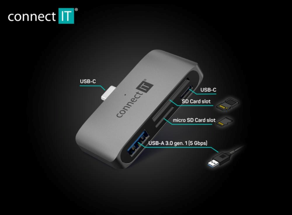 CONNECT IT Dokovací stanice CompactPRO USB-C, 1xUSB-A, 1xUSB-C, MicroSD/SD, šedá
