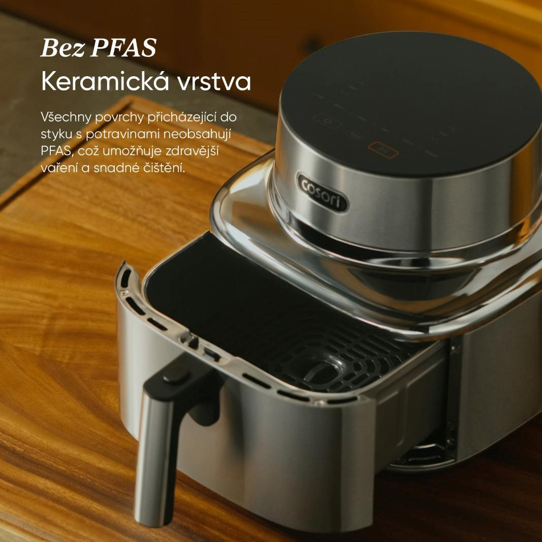 COSORI Iconic byl navržen jako přirozená součást moderního interiéru, ne jako obyčejný spotřebič. Nerezová ocel a tvrzené sklo vytvářejí čistý, klidný vzhled, který krásně zapadne do minimalistických kuchyní. Je to objekt, který potěší oko pokaždé, když kolem něj projdete.