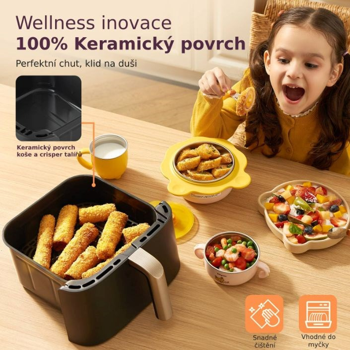 Zdravé vaření nyní získává zcela nový význam. Díky keramickému povrchu košů a až o 95% nižší spotřebě oleje si můžete užít smažená jídla mnohem zdravěji a především chutněji. Integrace chytré aplikace umožňuje ovládat horkovzdušnou fritézu na dálku, což poskytuje přístup k tisícům receptů a průběžnému stavu vaření, což usnadňuje přípravu zdravých a chutných pokrmů. Se sedmi univerzálními funkcemi, včetně fritování, pečení, grilování, sušení nebo kynutí, jde skutečně o multifunkční zařízení, které obohatí vaši kuchyni o neomezené možnosti vaření. Díky Wi-Fi konektivitě můžete fritézu ovládat a sledovat i vzdáleně a s aplikací získáte přístup k receptům a výživovým tipům.