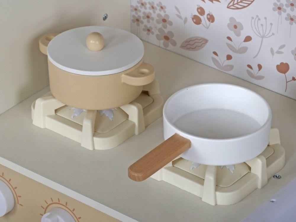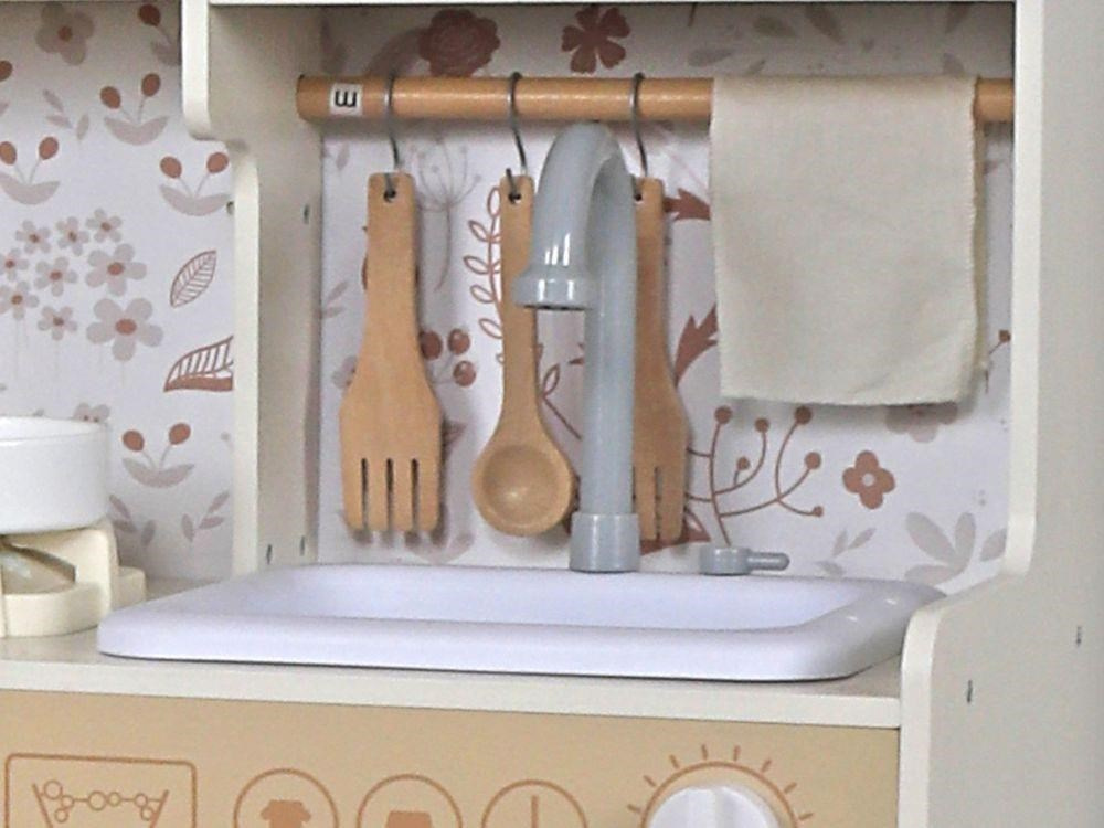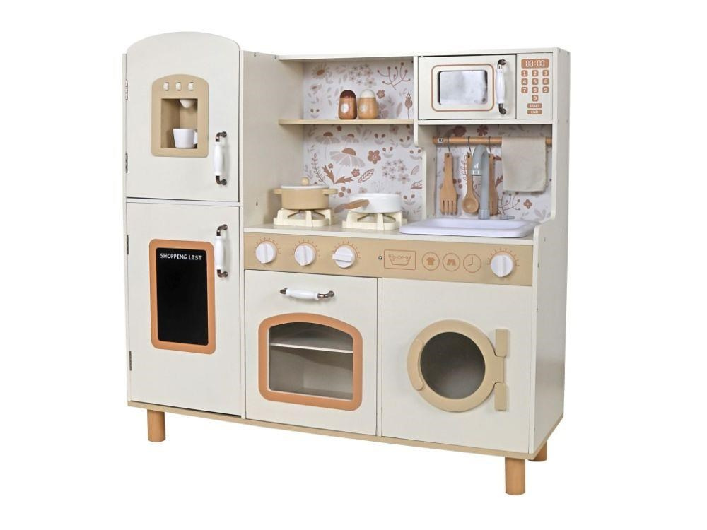Dětská kuchyňka ve světlých barevných tónech, zdobená květy, je stylovou edukativní hračkou pro děti od 3 let věku. V dřevěné kuchyňce s moderními spotřebiči a tekoucí vodou popustí děti uzdu své fantazii, mohou vařit, péct a ohřívat pokrmy, uvařit kávu a klidně vyprat špinavé prádlo. Jednoduše si vyzkouší dospělácké činnosti bezpečným dětským způsobem. Reálný nádech celé hře dodají zvukové efekty, které vydává sporák nebo vodovodní baterie..