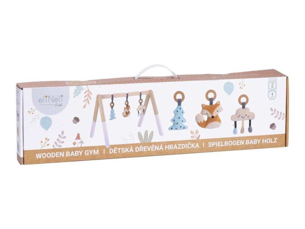 Dřevěná dětská hrazdička se závěsnými hračkami v podobě roztomilé lištičky, stromečku a obláčku upoutá pozornost každého miminka. Dětská hrazdička v neutrálních barvách, vhodná pro holčičky i chlapce, stimuluje dětské smysly, motivuje miminka k pohybu a prozkoumání závěsných prvků. Každou z měkkých hraček můžete z dřevěné hrazdičky sundat a použít jako samostatné hračky..