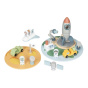 Dřevěná vesmírná základna se spoustou dřevěných prvků zavede děti do vesmíru. Hračka umožňuje dětem rozložit si základnu na Zemi i ve vesmíru, naplánovat start raketoplánu i vesmírnou misi na právě objevené planetě. Součástí balení jsou různé dopravní prostředky, satelity a astronauti..