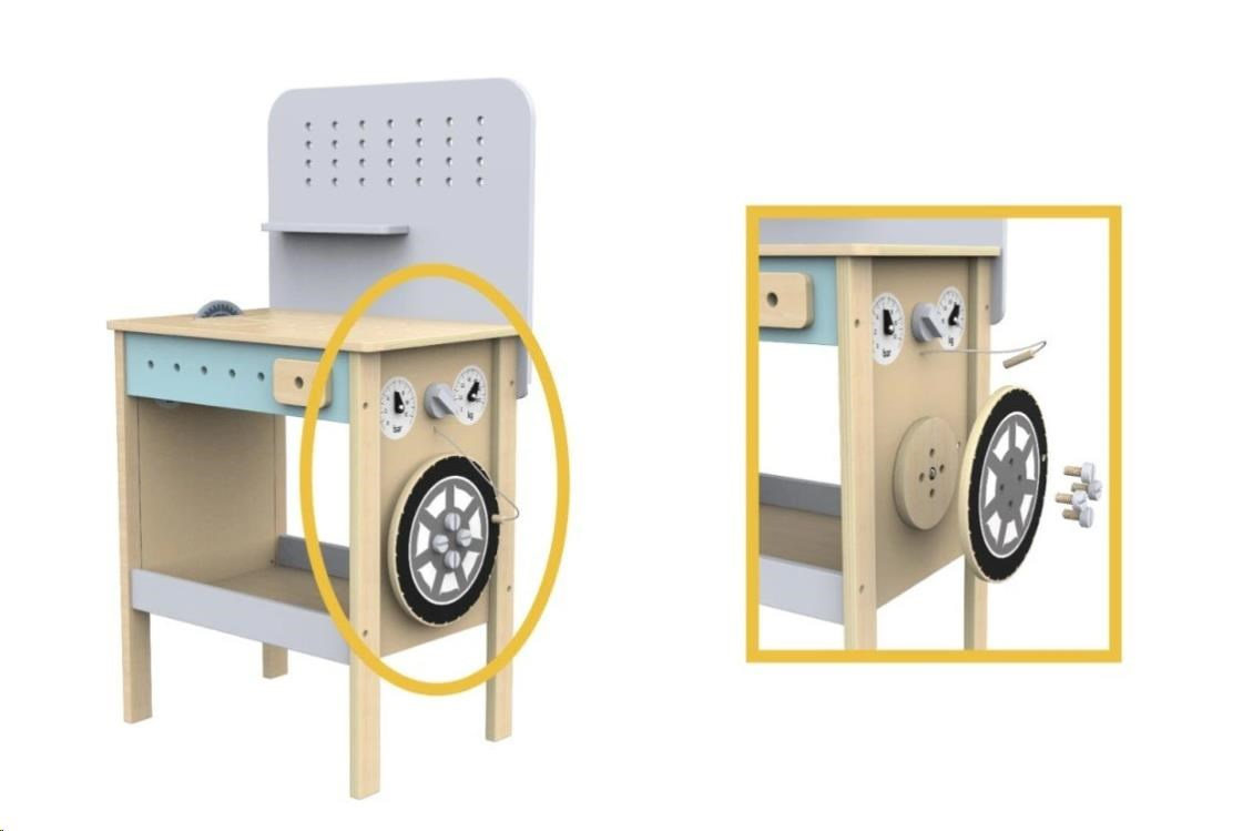 • Kompresor - tento zábavný doplněk umožní dětem vžít se do role automechanika, nasadit kolo na ponk, hrát si na to, že kolo dofukuje a opět kolo z ponku sundat.