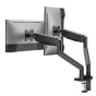 Díky odolné ocelové konstrukci poskytuje stabilní podporu pro dva monitory s úhlopříčkami 17" až 35" a hmotností až 16 kg. Flexibilní konstrukce pro dostatečné nastavení výšky a pozorovacích úhlů s možností nastavení orientace monitoru na výšku nebo na šířku. Součástí balení jsou průchodky a svorky pro instalaci na téměř jakoukoliv pracovní plochu. Odnímatelná deska VESA pro uživatelsky přívětivou instalaci.
