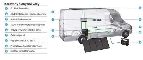 Power Hub umožňuje připojovat kombinaci až 4 vstupů s celkovým výkonem až 6000 W. Využijte kombinaci solárních panelů, generátorů pro vaše ostrovní systémy. Dobíjet můžete Power Kit i karavanu ze sítě AC 230 V nebo Power Kit připojit k alternátoru vozidla.
