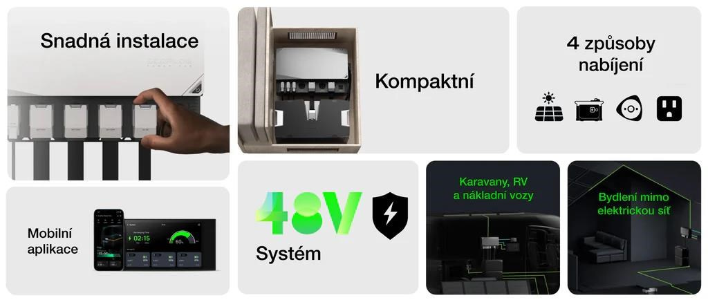 *Zakoupením LFP akumulátorů EcoFlow můžete získat celkovou kapacitu až 15 kWh. Kombinovat lze až tři 2 kWh akumulátory (tj. 2 kWh, 4 kWh nebo 6 kWh) nebo až tři 5 kWh akumulátory (tj. 5 kWh, 10 kWh nebo 15 kWh).