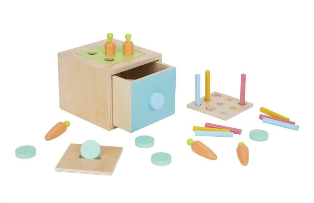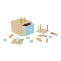 Dřevěná edukační hračka (box), pro děti od 1 roku, představuje hned 3 hračky v jednom. Multifunkční bedýnka (box) s výměnitelným horním dílem je zábavnou vkládačkou s mrkvičkami, s barevnými válečky nebo pokladničkou. Díky 3 výměnitelným destičkám děti mohou hrát různé hry, zdokonalovat své dovednosti a užít si spoustu legrace.
