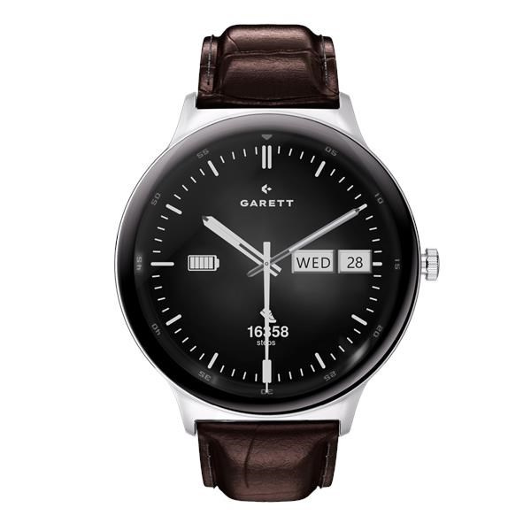 Elegantní chytré hodinky s 1,43” AMOLED displejem (466 × 466 px), ochranou Gorilla Glass a ultratenkým pouzdrem o tloušťce 7,5 mm. Nabízejí Bluetooth hovory, monitoring zdraví (tep, krevní tlak, SpO2, stres), sledování spánku a více než 100 sportovních režimů. Výdrž až 7 dní na jedno nabití, voděodolnost IP68, kompatibilita s Android a iOS (Garett Smart). Součástí balení je ocelový i kožený řemínek..