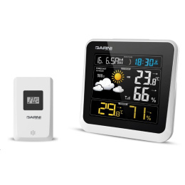 Meteorologická stanice se špičkovým inverzním barevným VA displejem s časem a datem řízenými rádiovým signálem DCF-77, budíkem, měřením vnitřní teploty, relativní vlhkosti a absolutního barometrického tlaku a bezdrátovým čidlem pro měření vnější teploty a relativní vlhkosti. - špičkový inverzní barevný VA displej o rozměrech 106 x 94 mm s možností stálého osvětlení při napájení síťovým adaptérem, nebo krátkodobým osvětlením na 10 s při napájení bateriemi - tři stupně jasu osvětlení displeje (při napájení síťovým adaptérem) - velikost číslic na displeji – čas, datum a zkratka názvu dne 10 mm, vnitřní teplota a relativní vlhkost - 17 mm, vnější teplota a relativní vlhkost 19 mm, barometrický tlak 4,5 mm - čas a datum řízené signálem DCF-77 s možností manuálního nastavení - ikona příjmu signálu DCF-77 - 12ti, nebo 24 hodinový formát zobrazení času - možnost nastavení časového pásma od -12 do +12 hodin - budík pro buzení každý den, nebo v pracovní dny s funkcí opakovaného buzení (Snooze) po 5 minutách - budící signál - 10 sekund 1 pípnutí za sekundu, 10 sekund 2 pípnutí za sekundu, 10 sekund 4 pípnutí za sekundu a poté stálé pípání - 6 ikon předpovědi počasí (jasno, polojasno, oblačno, srážky (déšť), srážky (sněžení), přívalové srážky) na základě sledování barometrického tlaku vestavěným barometrickým čidlem - zobrazení hodnot vnitřní a vnější teploty a relativní vlhkosti - šipky vývoje teploty, relativní vlhkosti - alarm horní a dolní meze venkovní teploty v rozsahu od -40°C do +70°C a to pro každý kanál zvlášť. - měření absolutního barometrického tlaku (hPa/mb nebo mmHg) - zobrazení teploty ve °C, nebo °F - paměť na maximální a minimální naměřené hodnoty teploty a rel. vlhkosti s automatickým nulováním ve 0:00 hodin - možnost použití až 3 bezdrátových čidel GARNI 045H (jedno čidlo je součástí dodávky) - funkce automatického přepínání kanálů na kterých jsou bezdrátová čidla přihlášená po 5 s - bezdrátový přenos hodnot vnější teploty relativní vlhkosti na frekvenci 433 MHz - zobrazení fáze Měsíce - ikona slabých baterií hlavní jednotky a venkovního čidla - napájení hlavní jednotky síťovým adaptérem nebo bateriemi - délka kabelu síťového adaptéru 1,75 m - možnost postavení, nebo zavěšení - barva černá se stříbrným rámečkem Bezdrátové čidlo GARNI 045H - displej o rozměrech 18 x 10 mm - velikost číslic na displeji: teplota 4 mm a relativní vlhkost 3,5 mm - měření teploty a relativní vlhkosti - možnost postavení, nebo zavěšení - barva bílá Obsah balení: 1 x hlavní jednotka GARNI 525 1 x bezdrátové čidlo GARNI 045H 1 x síťový adaptér český, slovenský, německý, anglický, polský, maďarský a italský návod.