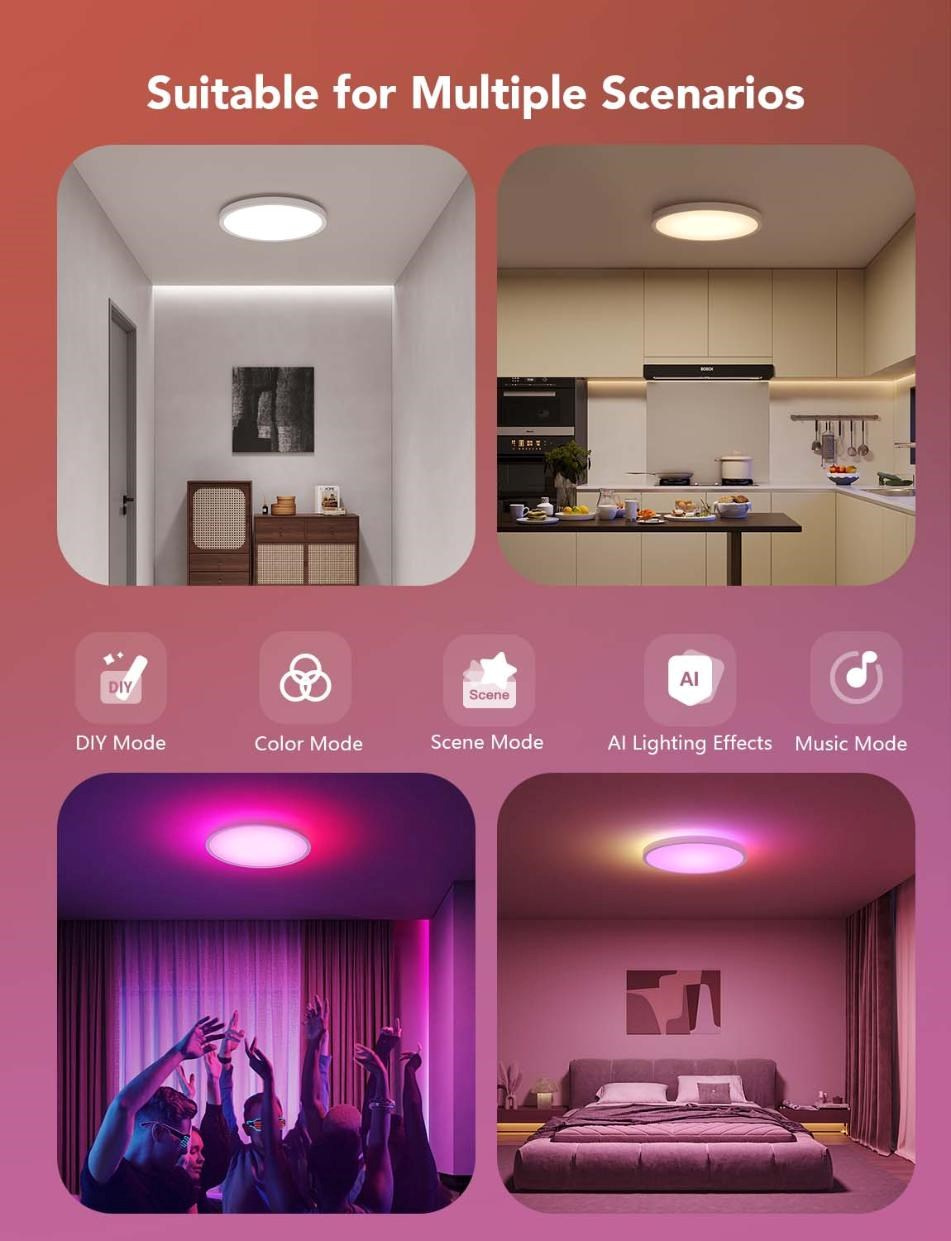 Objevte více než 70 chytrých scén pro dokonalé osvětlení vašeho prostoru! Duální stropní lampa Govee nabízí mocný DIY režim v aplikaci, který vám umožní vyrobit si osvětlení podle vlastních představ. Snadno vytvořte atmosféru, která vyhovuje každé příležitosti a stylu. S funkcí Dreamview navíc synchronizujete více svítidel Govee do stejné barvy pro parádní efekt. Oživte svůj domov s Govee!