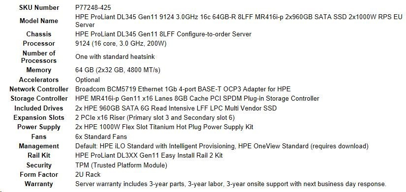 | Model Name | HPE ProLiant DL345 Gen11 9124 3.0GHz 16c 64GB-R 8LFF MR416i-p 2x960GB SATA SSD 2x1000W RPS EU Server |