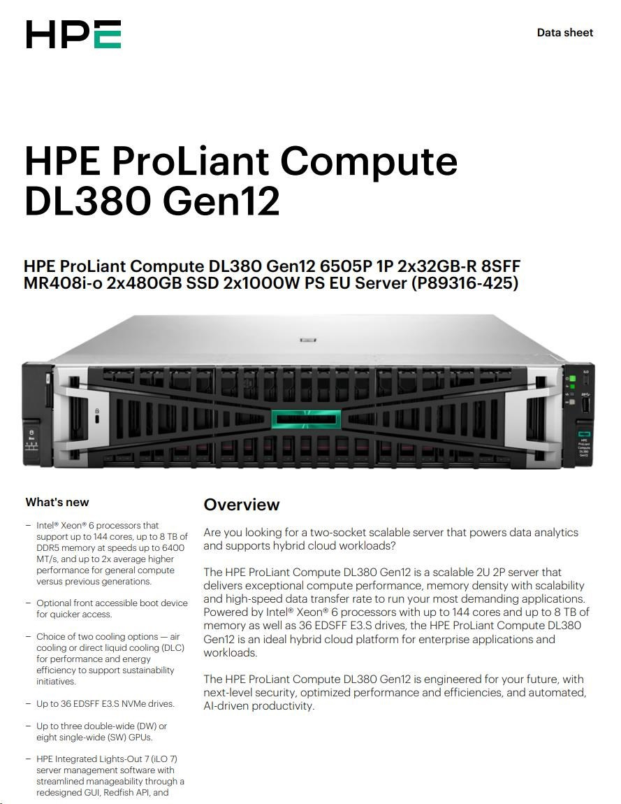 HPE PL DL380 Gen12 6505P (2.2/12C) 2x32G (P69727) 2x480G MR408i-o 8SFF 2x1000W 10GbE NBD333 Smart Choice.