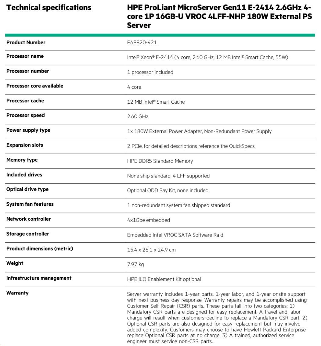 Technical specifications HPE ProLiant MicroServer Gen11 E-2414 2.6GHz 4core 1P 16GB-U VROC 4LFF-NHP 180W External PS Server P68820-421