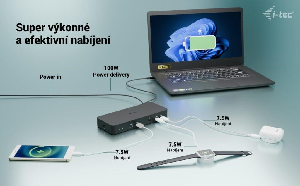 • Dokovací stanice poskytuje až 100 W výkonu pro napájení připojeného notebooku nebo tabletu.