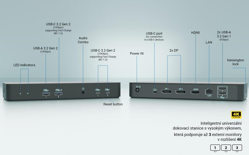 Vysoce výkonná dokovací stanice nové generace s USB-C, která podporuje připojení až tří externích monitorů v rozlišení až 4K. Lze ji použít s prakticky jakýmkoliv notebookem vybaveným porty USB-C, USB4 nebo Thunderbolt“ 3/4/5 a zároveň podporuje všechny běžné aktuální operační systémy.