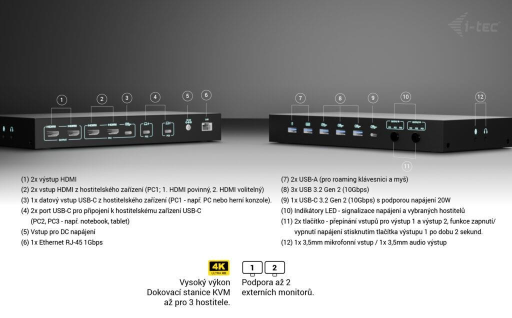i-tec USB-C KVM Dock PRO for Three Hosts, Dual Video, with 2x Power Delivery, max 92W