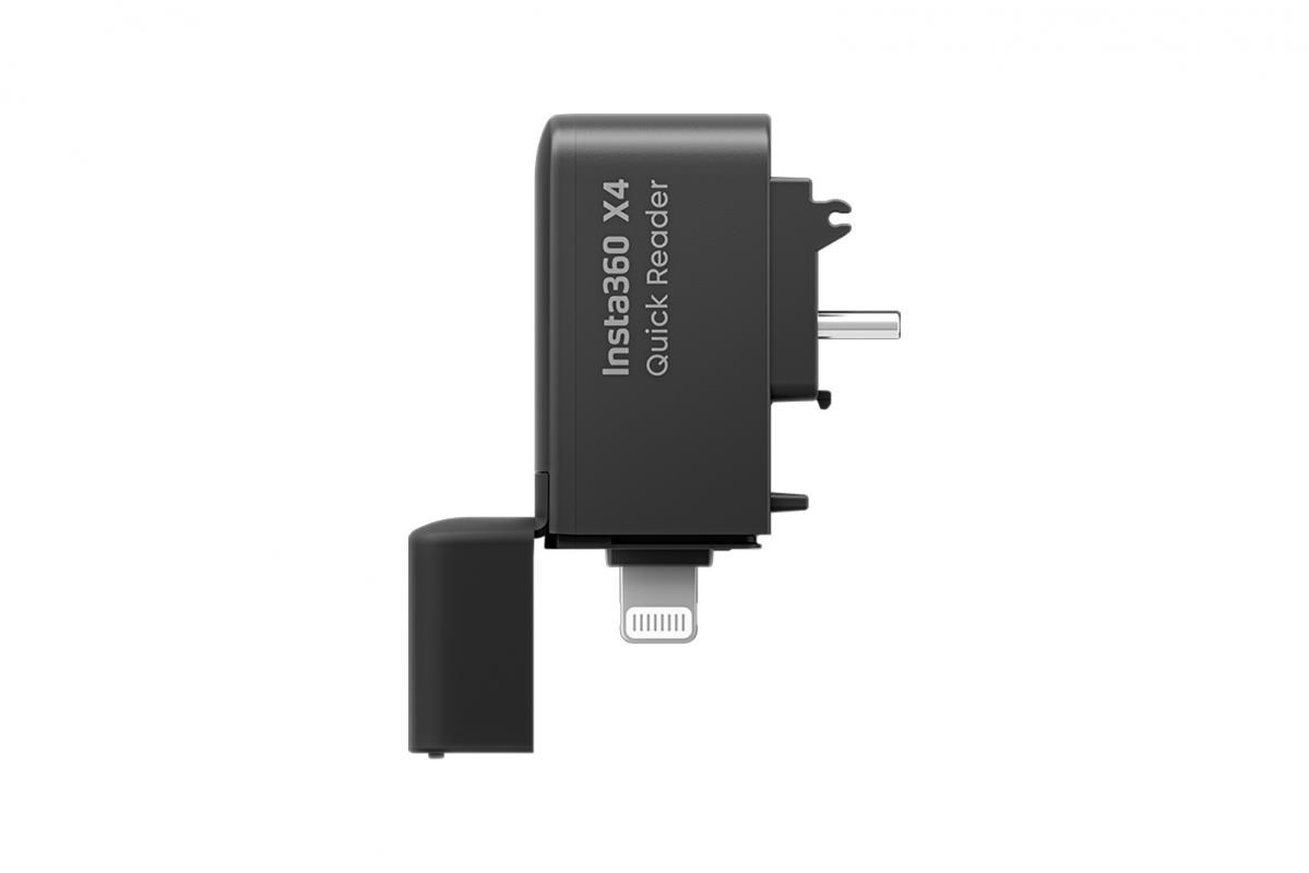 Rychlá čtečka karet pro kameru Insta360 X4. Čtečka slouží k rychlému stažení souborů z karty v kameře Insta360 X4 a následnému nahrání souborů do telefonu. Konektor Lightning/USB-C. Váha: 12,5g Rozměry: 46 x 14 x 31 mm.