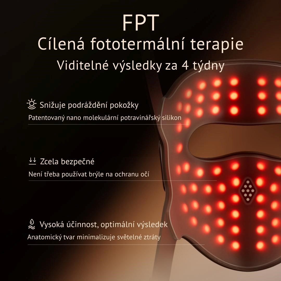 • Efektivní domácí terapie – až 6x účinnější než běžné LED masky. Patentovaná cílená fototermální technologie koncentruje světelnou energii do přesného bodu a působí přímo v hlubokých vrstvách pokožky.