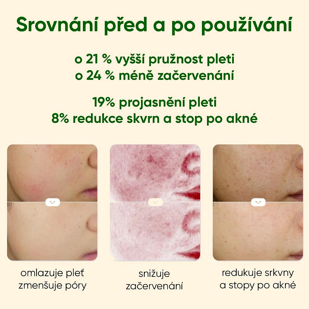 - Viditelné výsledky již za 4 týdny: Klinické testy prokazují zlepšení jasu pleti, zesvětlení skvrn a zmírnění zarudnutí.