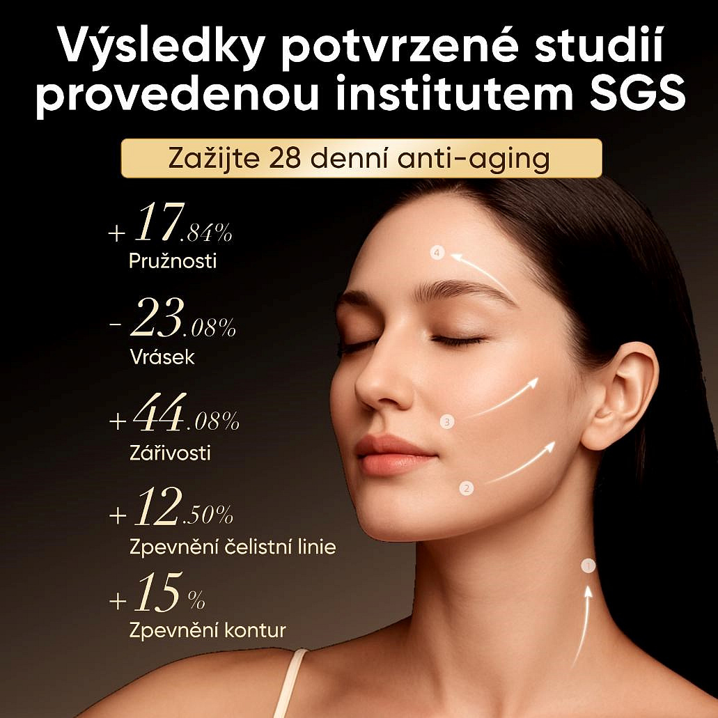 - Synergie s patentovanými séry: Speciálně vyvinutá séra s 18K zlatými nanotyčinkami a mořským kolagenem zvyšují účinnost ošetření až 7,65krát.
