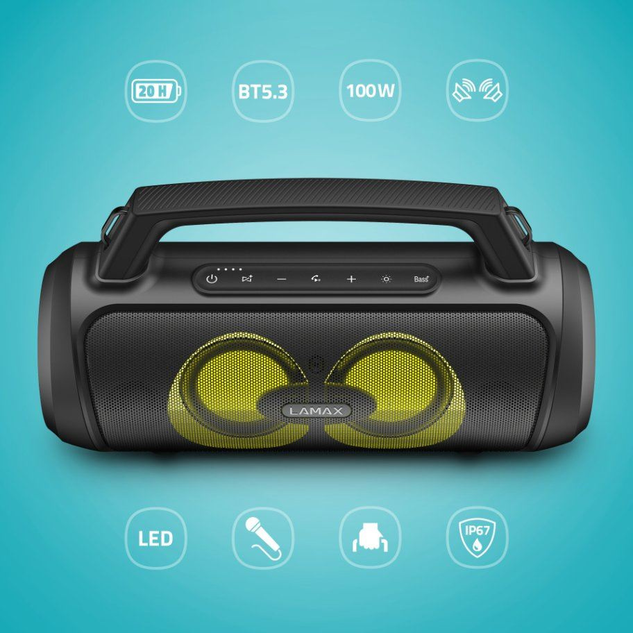 Přenosný Bluetooth party reproduktor s madlem, BT 5.3, výkon 100 W, 3 režimy LED podsvícení, 20 hodin výdrž, ovládání přes zařízení s iOS nebo Android, drátový mikrofon v balení, LAMAX BeatBass®, voděodolnost IP67, 6,3 mm jack, SD karta, USB-A vstup, funkce powerbanky, TWS funkce pro připojení druhého reproduktoru..