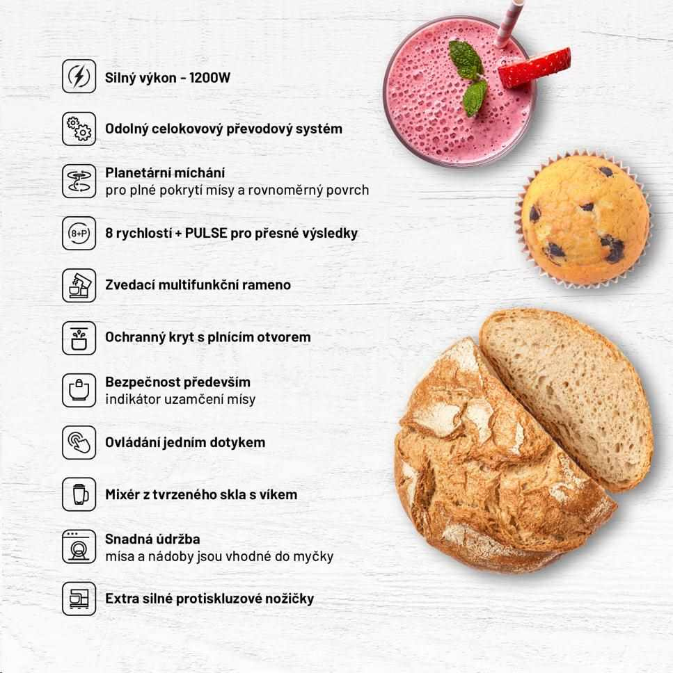 Kuchyňský robot, EffectiMix® planetární způsob míchání, příkon 1200 W, kovové vnitřní převody, kuchařka v balení, celoměděný motor, designové ocenění, objem nerezové mísy 5,5 l, 8 SpeedPrecision® rychlostí, PULSE, míchací a šlehací metla, hnětací hák, průhledný kryt mísy s otvorem, mixovací nádoba 1,5l z tvrzeného skla, sekáček, mlýnek na maso a tvořítko na klobásy.
