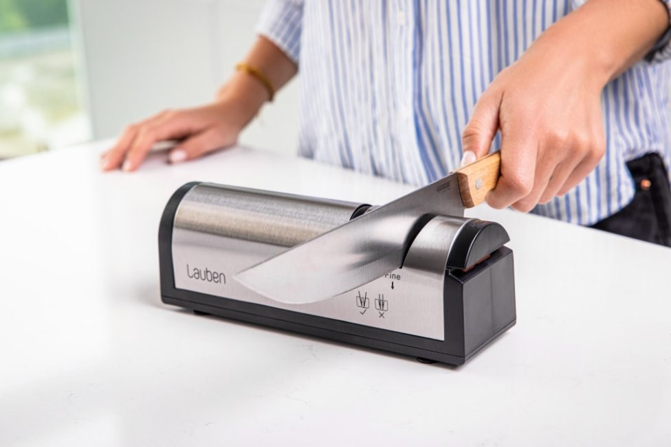 Díky Lauben Knife Sharpener 4700SB nabrousíte většinu nožů a sekáčků v pohodlí domova. Přidali jsme i speciální slot na broušení nůžek, i s těmi se tedy bruska Lauben poradí. Bruska umožňuje dva stupně broušení – hrubé a hladké začištění. Díky vodicím drážkám pro udržení správného sklonu a optimálnímu brusnému úhlu 15° zvládnete dokonale nabrousit každé ostří jako profesionál. Stačí brusku zapojit, spustit a vložit ostří, které chcete nabrousit.