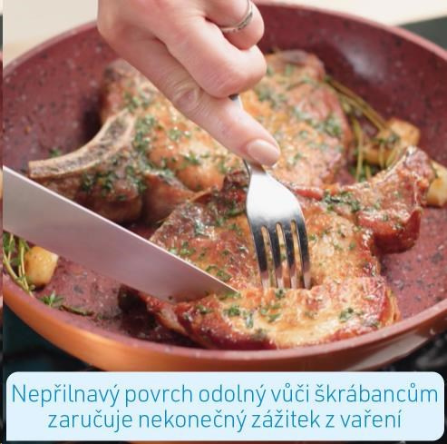 Zažijte i vy úžasný požitek s nejnovější generací pánví s nepřilnavým povrchem - Livington Copper & Stone Pan. Díky inovativní 7-vrstvé struktuře jsou dokonalé výsledky vaření ve vaší kuchyni od nynějška zaručené! Tajemství pánve spočívá v jejích vrstvách. Hliníkový trup je kombinován s extra silnou ocelovou vložkou. Jeho základem je robustní kamenný povlak pro nesrovnatelně dlouhou životnost a akumulaci tepla. Měď zušlechťuje kamennou vrstvu pro dokonalé rozložení tepla. Senzační složení pánve završují 3 vrstvy vysoce kvalitního nepřilnavého povlaku. Díky nepřilnavému povlaku odolnému proti poškrábání je zaručen skvělý zážitek z vaření, aniž se něco připálilo. Šťavnaté steaky, jemné ryby a křupavou zeleninu můžete připravit téměř bez tuku a oleje. Pevné hliníkové jádro vaší Livington Copper & Stone Pan zajišťuje extrémně rychlé a rovnoměrné zahřátí pánve s nízkou hmotností. Pánev je mimořádně robustní, odolná a snadno se čistí - stačí ji otřít hadříkem a je to hotové! Díky elegantnímu měděnému provedení se pánev stane absolutním poutačem pozornosti ve vaší kuchyni. Vaše pánev Livington Copper & Stone je vhodná pro všechny typy sporáků, jako jsou elektrické, keramické, plynové a indukční desky.