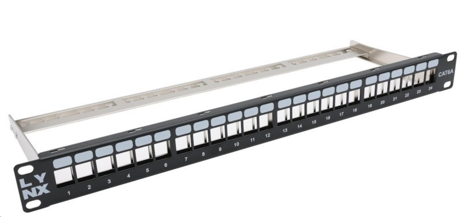 LYNX Patch panel, 19'', 24 portů, 1U, Cat5e/6/6A/7, neosazený, stíněný, vyvazovák, černý