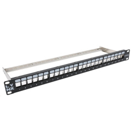 Patch panel 1U/19", 24 otvorů, neosazený, pro stíněné keystony, kategorie Cat5e/6/6A/7, černý (přední panel).