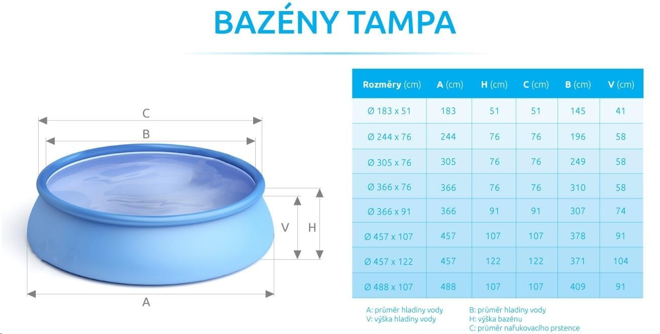 Bazén Tampa se řadí mezi neprodávanější a nejoblíbenější bazény v České republice. Koupání ve vlastním bazénu si může dopřát opravdu každý. Předností bazénu Tampa je nízká cena, snadná údržba i rychlé zprovoznění. Stačí jen připravit místo na bazén, rozvinout bazénovou podložku, bazén rozbalit, nafouknout horní límec a začít napouštět vodu. Stoupající voda sama bazén postaví. Od vybalení bazénu můžete do 10 minut napouštět vodu. Bazén je nutné po skončení bazénové sezony vyčistit, vypustit a uklidit na suché, nemrznoucí místo. Správnou údržbou prodloužíte životnost bazénu. Doporučujeme bazén po koupání zakrývat krycí plachtou. Pro snadné nafouknutí doporučujeme zakoupit ruční či elektrickou pumpu. Bazénová folie: Stěny a dno jsou vyrobeny z pružného a pevného 3vrstvého POLYSTRENGHT PVC materiálu. Barva imituje vzhled ratanu. Připojení filtrace: K bazénu můžete připojit libovolnou kartušovou či pískovou filtraci z naší nabídky. Pro napojení filtrace jsou připraveny průchody stěnou bazénu o průměru 32 mm (5/4"). Pro připojení pískové či kartušové filtrace je nutné dokoupit: 6 ks bazénových hadic 2 ks průchodu stěnou bazénu 1 ks instalační sady Součásti balení bazénu Tampa: bazén Tampa návod záslepky průchodů stěn bazénu Tolerance rozměrů bazénu: Uvedené rozměry bazénu jsou pouze orientační a ovlivnit je může rovnost podkladu, objem napuštěné vody nebo nafouknutí límce. Povolená výrobní odchylka je 5 %. Upozornění: Fotografie produktu jsou ilustrační Zapuštění bazénu Tampa: Bazén Tampa není určen k celkovému ani částečnému zapuštění do země. Jedná se o nadzemní bazén. Uskladnění bazénu Tampa: Bazén Tampa není určen k celoročnímu provozu a proto by měl být na konci koupací sezóny zazimován. Bazén je potřeba vypustit, umýt od nečistot, osušit a uložit na suché místo, kde nemrzne. Je vhodné ho v průběhu zimy občas přeskládat, aby ve folii nevznikaly přehyby. Prodloužíte tak jeho životnost. Rozměry a typ bazénu Barva: vzhled Ratan Průměr bazénu: 3,66 m Průměr hladiny vody: 307 cm Výška bazénu: 0,91 m Celkový objem vody v bazénu: 6,6 m3 Modelová řada: Bazény Tampa Konstrukce: Samonosný bazén Bazén: Bez filtrace Tvar bazénu: Kruh Vybavení bazénu Krycí plachta součástí balení: Ne Podložka součástí balení: Ne Schůdky součástí balení: Ne Skimmer součástí balení: Ne Rozměry a hmotnost balení 1. balík: 50 x 37 x 26 cm, 14,3 kg Hmotnost: 14.29 kg.