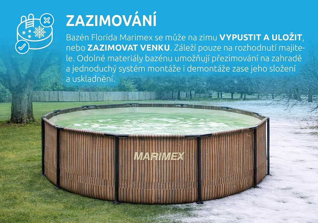 Bazén Florida Marimex se může na zimu vypustit a uložit, nebo zazimovat venku. Záleží pouze na rozhodnutí majitele. Odolné materiály bazénu umožňují přezimování na zahradě a jednoduchý systém montáže i demontáže zase jeho složení a uskladnění.