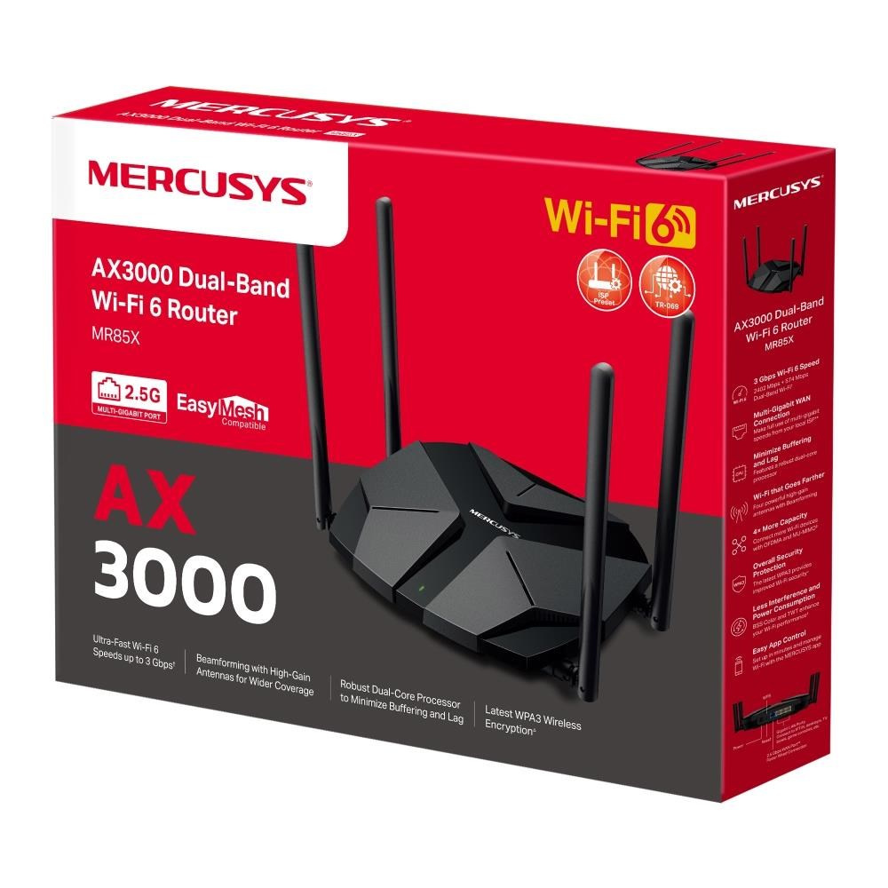 | Package Contents | • AX3000 Wi-Fi 6 Router MR85X • Power Adapter • Quick Installation Guide • RJ45 Ethernet Cable |